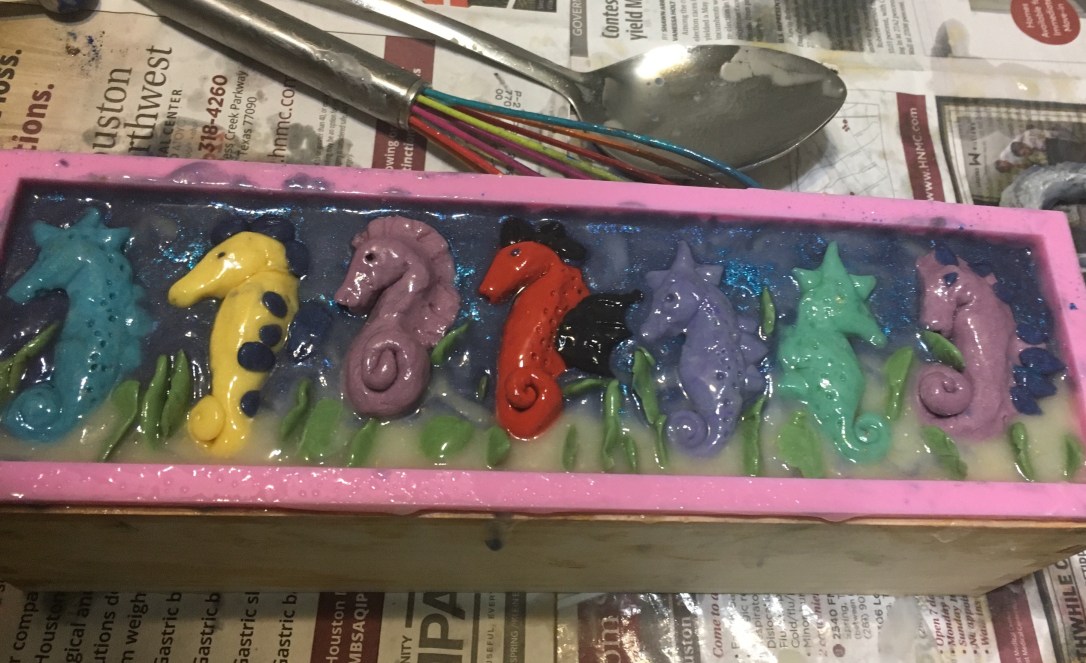 I used to belong to a local polymer clay guild a few years ago, and one time one of the members showed us how to make seahorses, which she had learned from someone else, so now I will show you what I remember of it and how I adapted it to soap dough, and thus the knowledge chain continues….hopefully.