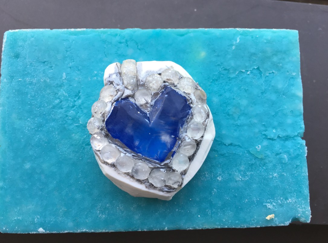 I made the hearts with melt and pour, which curiously, I did not melt! I just cut it and dried painted it with mica on the back. The smaller rhinestone looking pieces were melted and I used a mold for that.