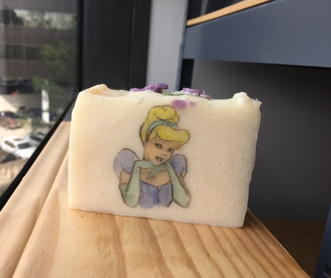 Sometimes you may want to personalize a bar for a special gift, and rather than designing a whole loaf of soap around a theme, you can do it by painting/stamping just the one or two bars that you want to give. Here is how I did it for a Cinderella soap test.