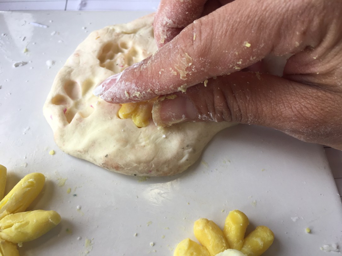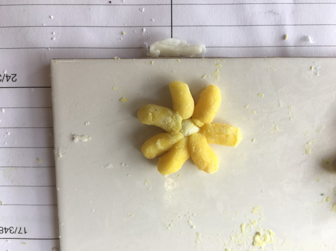- Shape a bigger piece of soap dough (for the petals) into a larger ball and place it on top of the smaller one.