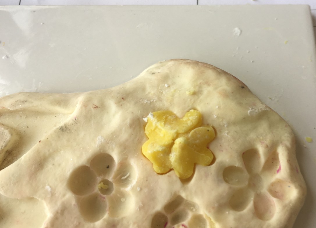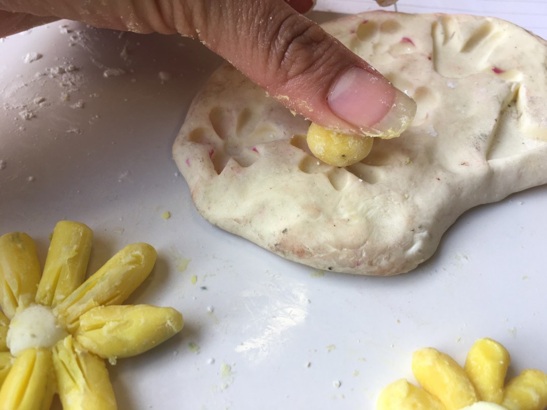 - Take a tiny piece of soap dough in the color you want for center of the flower, roll into a ball and place it at the center (if your flower mold/mould has a center/core)