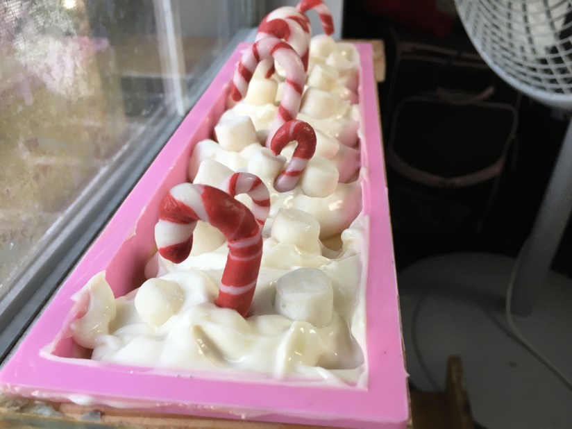 Back to the soap, I had two chocolate fragrances: Chocolate chip from Nature’s Garden and Dark Rich Chocolate from Brambleberry. Each has a different vanillin content, vanillin oxidizes when exposed to oxygen, which means that each would turn to different shades of brown. For the white portion, I used peppermint candy fragrance from Wholesale Supplies (which seems to fade after a few weeks).