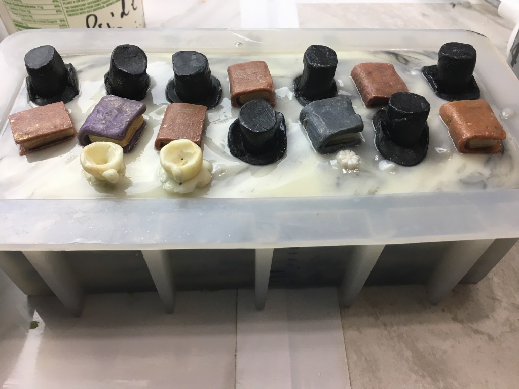 I liked that movie though, it is one of the few movies I have been able to watch more than once. (The other being Forrest Gump). I have a hard time watching a movie more than once because I have a good memory for movie dialogue and scenes, which makes it boring watching anything a second time. Anyway, it is the scene of Elizabeth going to Pemberley in this movie that inspired the soap colors (or lack thereof, if we consider that black and white are not real “colors” but rather the absence or fullness of them), I wanted to create a marble like effect to denote the luxury of Pemberley, and did the book embeds to represent Elizabeth, who loves to read; and a top hat to represent Mr. Darcy. (I was thinking of the scene in the 2005 film when he is riding his horse and meets Elizabeth and her sisters on the street, and then realizing Mr. Wickham is with them and leaving abruptly.)