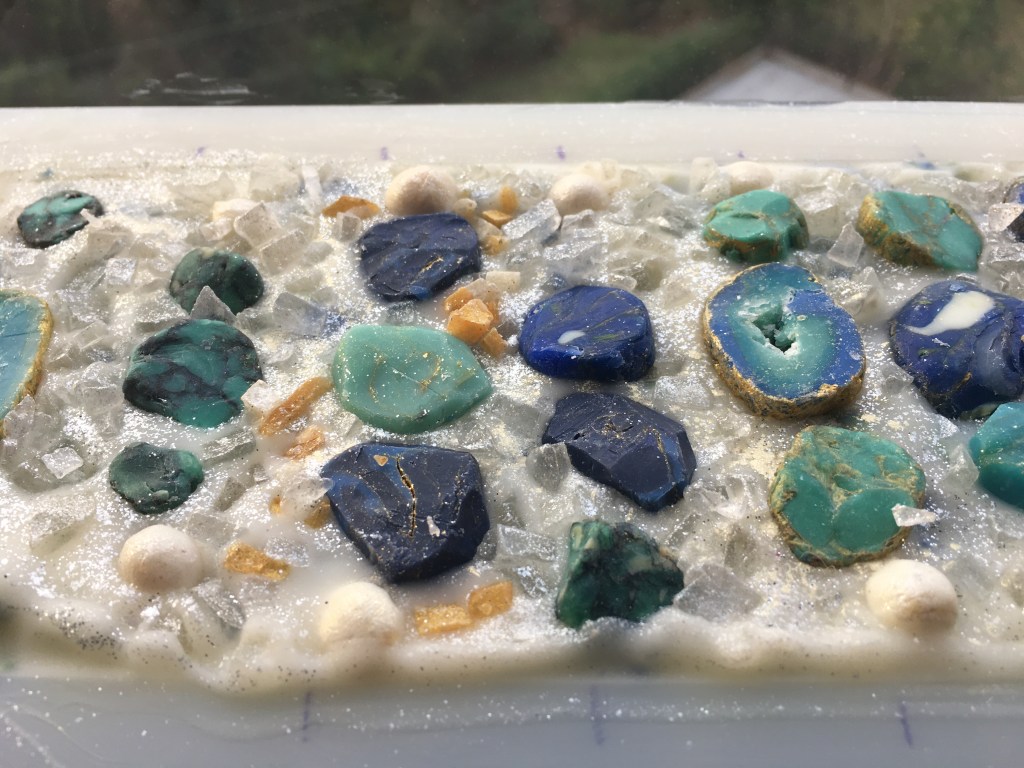 I made some new lapis lazuli embeds, with a similar process to the turquoise soap embeds. However, if your soap dough has a harder consistency, like polymer clay, this process might work better.