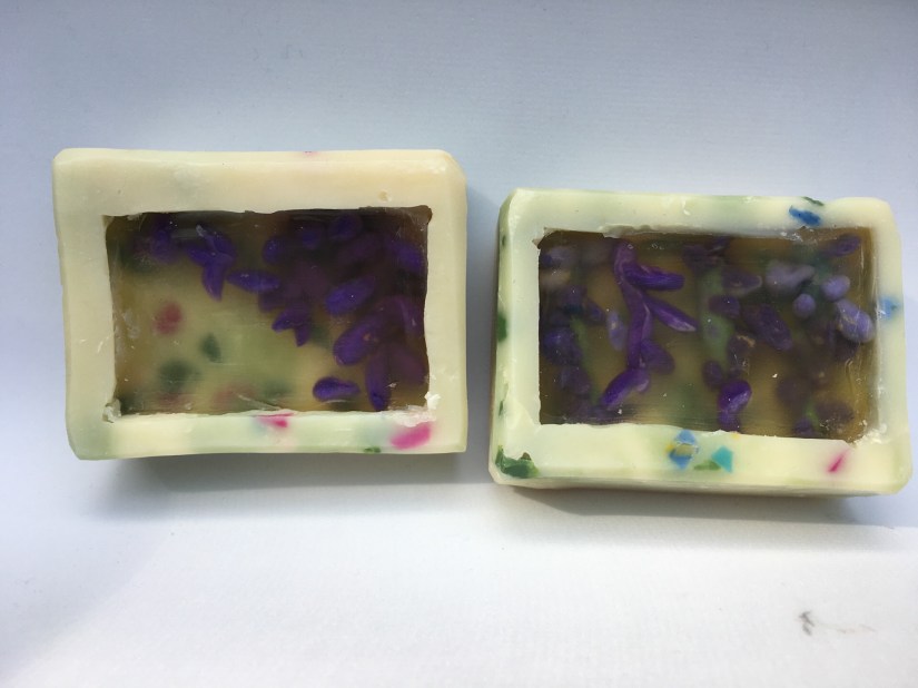 What is a hybrid soap? you might ask…Well, for me it is a soap made with two different methods. In this case, melt and pour and cold process soap. Though it can be argued that melt and pour is not really soap but a synthetic detergent bar. However, that is not the purpose of this post.