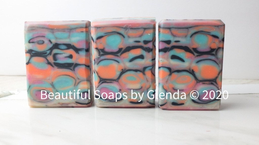 This soap is the result of that inspiration, though not all the colors match it exactly. I decided to go for the Pour/Pull Screen Method, and this is what I got: