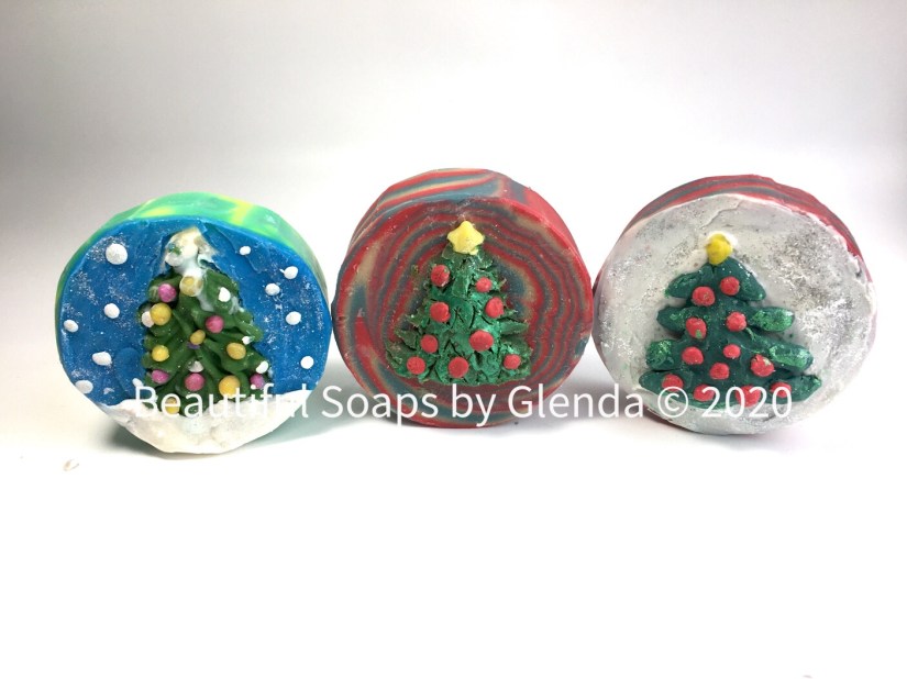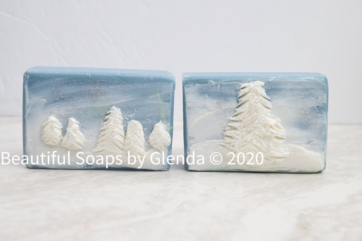 The trees above are actually embeds, (cold process embeds) that I already had and used soap dough as a thick glue past to adhere them. It helps if you scratch and remove some of the top surface of the soap before, to expose a more moist area to which the soap dough can attach to.