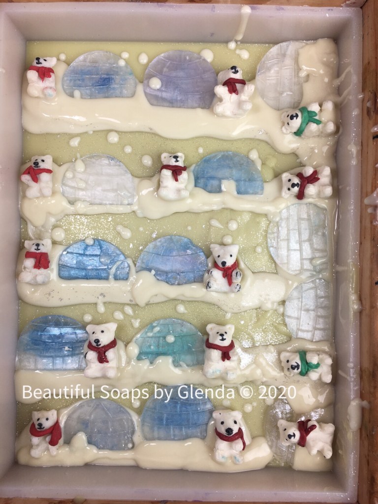 - Igloos: Made with Crystal Clear MP I cut thick slices from the block, and then cut partial circles with a circular cookie cutter. I brushed blue mica on the back and scored the front to make “blocks”.