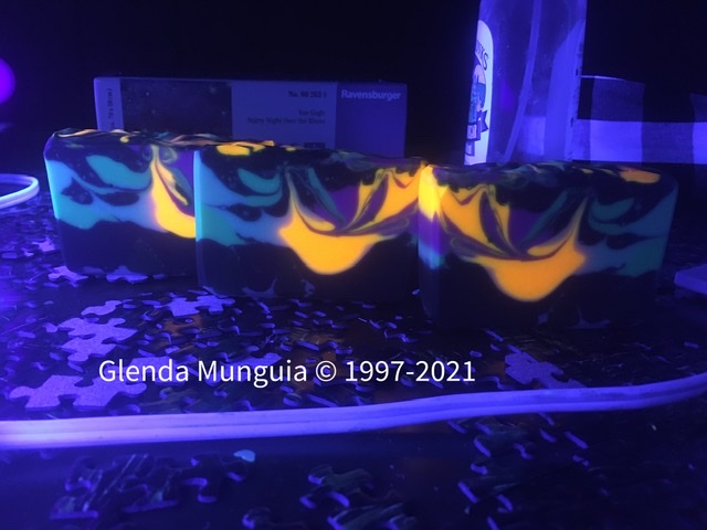 Not that I am planning to bathe under UVA/black lights, but good to know what would happen should I choose to. The fragrance seemed to accelerate the trace some, which most fragrances are bound to do with my soap recipe (that has 55% or so of hard butters and fats). So I do want to attempt this soap again sometime in the future, but for now, here are the links to supplies and the recipe: