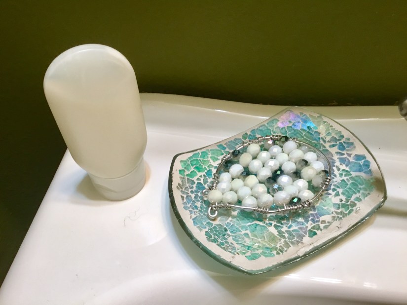 There are many styles of soap draining dishes, a soap dish could be made out of anything that stands well to water, as long as it allows for drainage and keeps the soap from being in a pool of water. Having been in the costume jewelry making hobby for a while, I had an assortment of beads and wires to choose from. I opted to finally put to use the round acrylic beads I have been storing for a long time, and for wire I went with both aluminum and stainless steel.