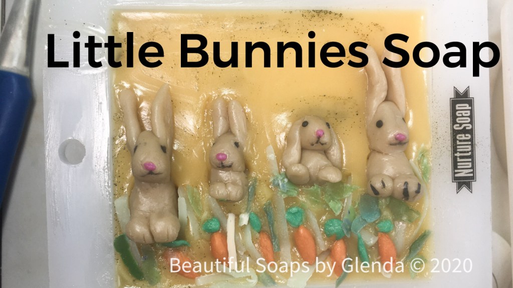 When I think of bunnies I picture them being white; however, I made these ones light brown because I was inspired by the bunnies of a friend, Jen from Jen spice. She has two angora rabbits and they are tan colored. (She has more now actually) Her rabbits are very furry though, and she sometimes uses their silky strands in soap. I wasn’t sure how to make a furry bunny though, so this is the best I could come up with.