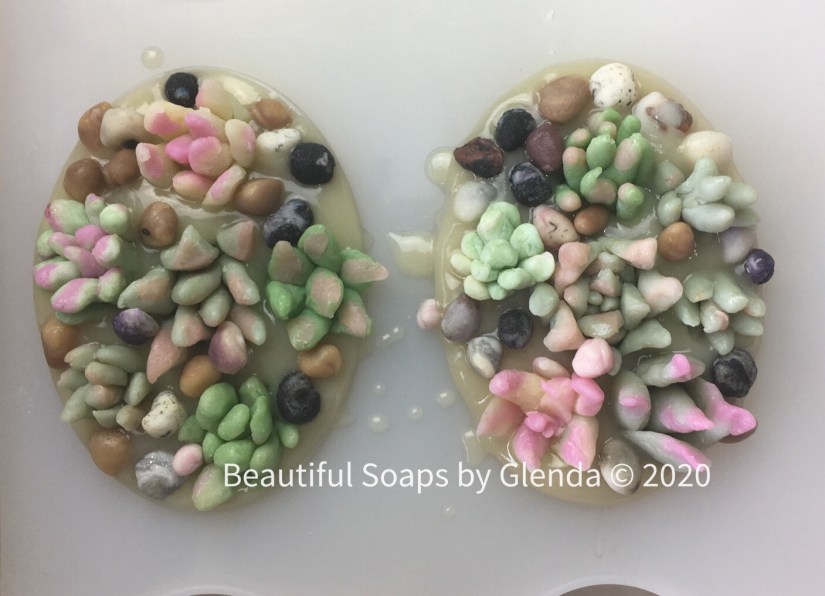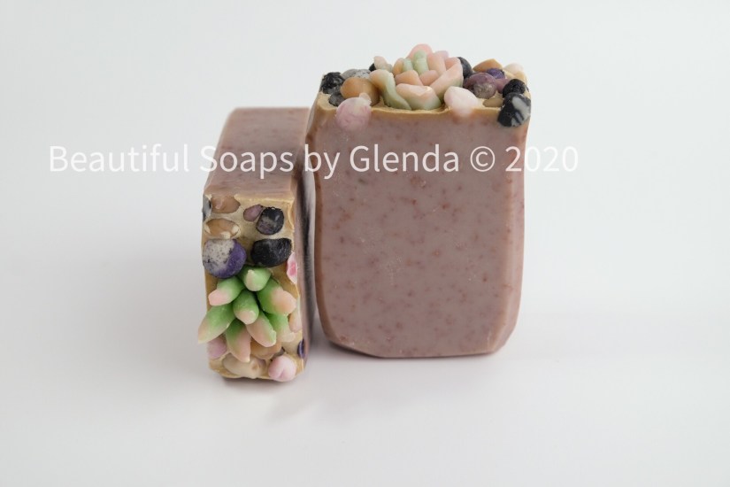 ANYHOW, this was one of the reasons that kept me from attempting a succulent soap, which I saw often in the different Facebook groups I belong to. Then one day, at the hardware store, in the garden section, I saw some succulent plants and suddenly got inspired and thought…why not? Initially, I wanted to make something similar to some faux succulent decorations I had bought, which were inside a round glass container. But my initial attempts at that didn’t work (I wanted to use melt and pour soap instead of the glass but I could not manage to make it into an oval shape while keeping it very see-through) so I did a more traditional succulent soap instead.