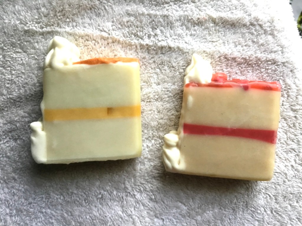 This fragrance is sweet and although it does not have vanillin, it does discolor slightly. Below is a picture 2 months later, next to the orange cake soap.