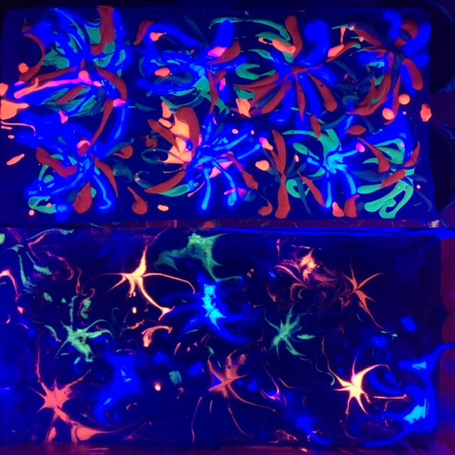 Which brings us to this soap, in which I wanted to highlight both the fireworks and the grilling activity associated with it. I used neon pigments so that under UV light they could resemble fireworks better.