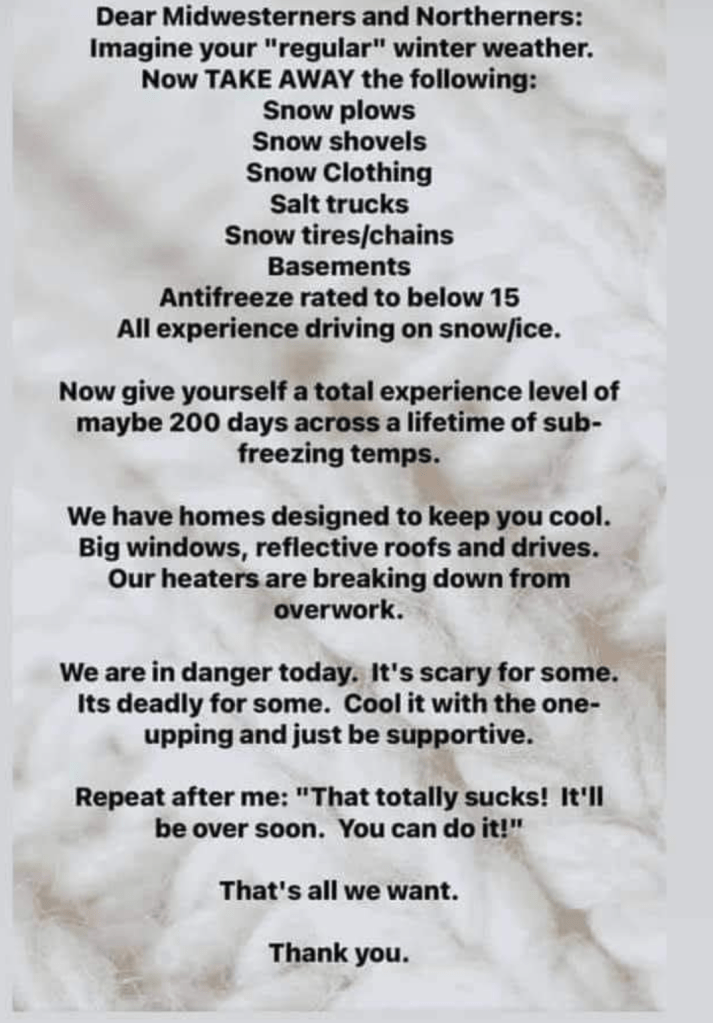 Have had a rough week. Record breaking temperatures for Texas. Two winter storms in a week and loss of power and water for millions. I have lived in Texas for 20 years. I can count on one hand the number of times it has snowed in those 20 years. (Suddenly I feel very old). Anyway, all the times prior, when it snowed, it kind of followed the same pattern: The news would announce it, people would freak out initially, and then start looking forward to making a one foot tall snowman with their kids. School would be cancelled and local government would encourage everyone to stay home. Then the snow would fall, a very light white dusting on top of the grass would appear overnight, and people would take pictures and post them in social media. Then by the afternoon the sun would melt the snow and life went back to normal.