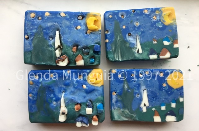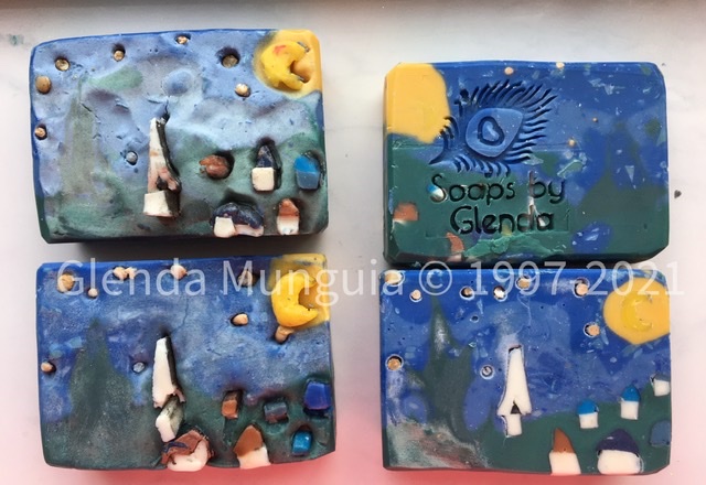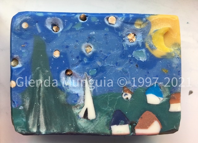 Last night I made the village and the stars and the moon with leftover soap. I cannot properly call it soap dough because most of it had hardened due in part to a lack of proper storage. So instead of using an extruder, which would have made it easy, I had to cut and manually shape the village and the stars. Last time I used an extruder and it was faster. I may dust the houses later with black mica for an outline effect.