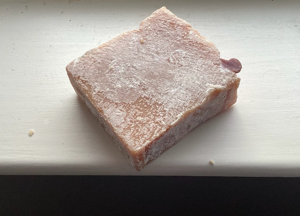 In the ghost swirl technique, one part of the soap has a higher water concentration and another part has the opposite, low water concentration. My peacock soap developed DOS faster than any other soaps I had experienced with. The areas with excess water turned orange/yellow and had that peculiar smell of rancid soap. I asked within the group if anybody had seen or noticed this, the only person who had experienced it was the host, Amy, because she had not used her usual red palm oil. Given that my oils were the same as those of any other soaps made within that timeframe, and that only this soap had DOS, I believe that the water, the extra water, was at fault. However, I should also note that this peacock ghost swirl soap did not have any ROE or EDTA, as additives were against the rules of the challenge. And I’m sure that also played a role.