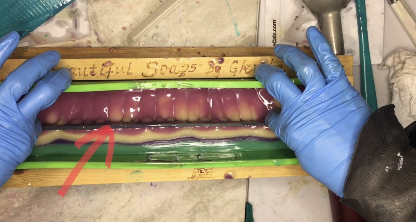 Lately, I have found the process of layering the colors for this technique in the mold to be more time consuming than desired; and if done on a loaf mold, quite challenging. so I had been thinking of whether it could be done in combination with a soap divider, like the one used for the Taiwan swirl technique, since it seems faster to pour that way, though the layers are thicker. (Unless I use more dividers)